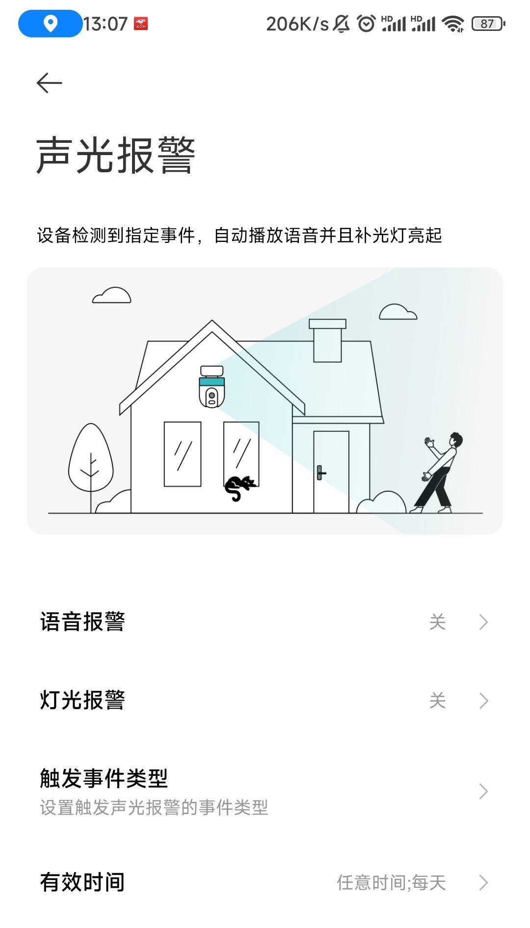 ▼声光报警的详细设置就是这些,可以选择只开声音或者只开灯光或者全开,大家根据实际使用环境决定