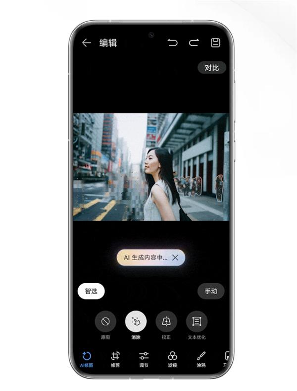 使用该功能时,只需进入图库——编辑——AI修图——消除。这里系统提供了两种模式,默认进入智选模式,在消除对象内部画一条线,系统便能准确理解你的操作意图,快速识别并扩散选中要消除的对象;还可以点击“手动”按钮选择手动模式,涂抹哪里即选中哪里。手动模式支持调整画笔大小,可以满足用户对特定场景进行精细化调整的需求。