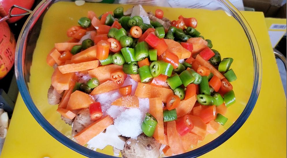 2、切好的洋姜放进一个大一点的盆中,加入提前切好的胡萝卜条,青红辣椒圈,大蒜,10斤洋姜加入8两的盐,50克的白糖搅拌均匀,把洋姜腌制1个小时。