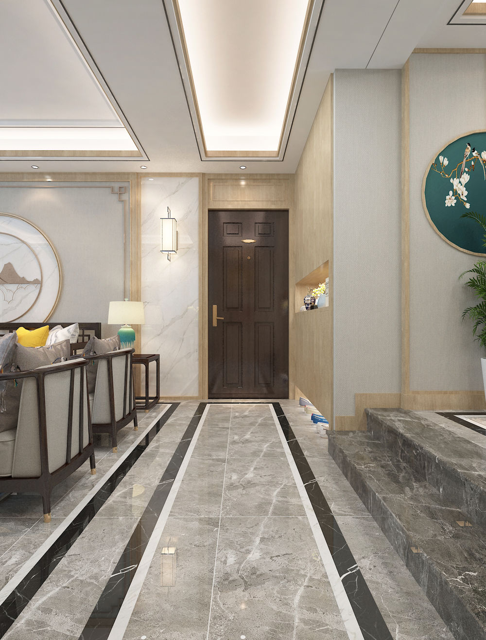 狭长的过道采用的是最简洁的石膏板方形吊顶,中间的灯光在夜晚打开显得整个过道非常敞亮,一点也不再畏惧黑暗;过道空间也做了一排嵌入式的储物柜,依然采用的是苏木色,瓷砖选择的颜色和木色是同色,整体显得格外温馨。
