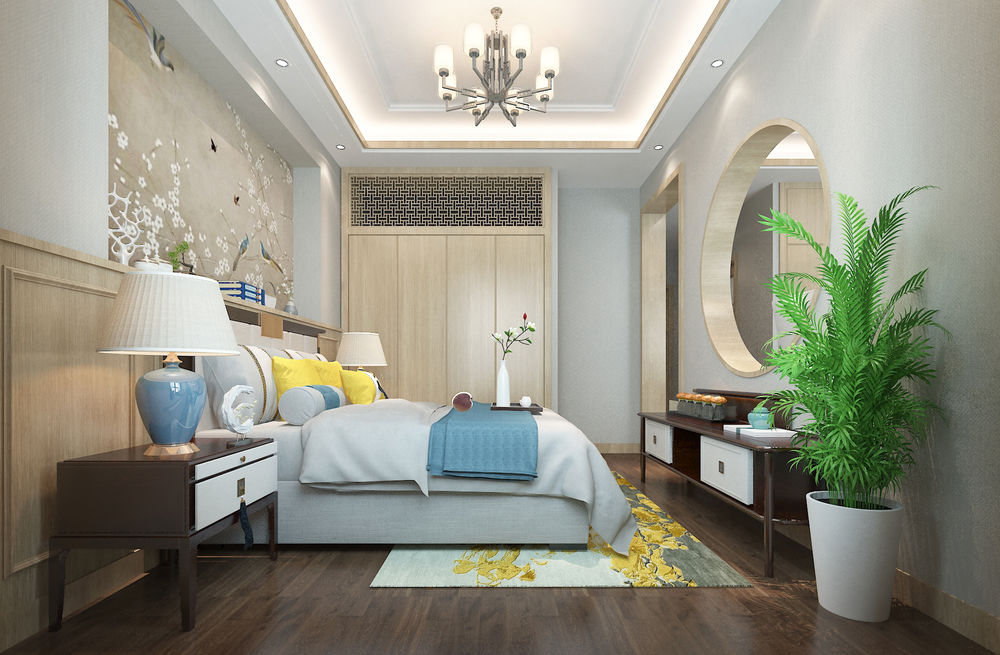 这个卧室是业主父亲的房间,因为只有一个人居住,所以只选择摆放了1.5M的床,再加两个床头柜,因为是老人家居住,担心亮度不高,所以选择暗藏灯带之后还加了主灯,卧室里面有个弧形的飘窗,摆上一张躺椅,平时可以躺在这里休息。