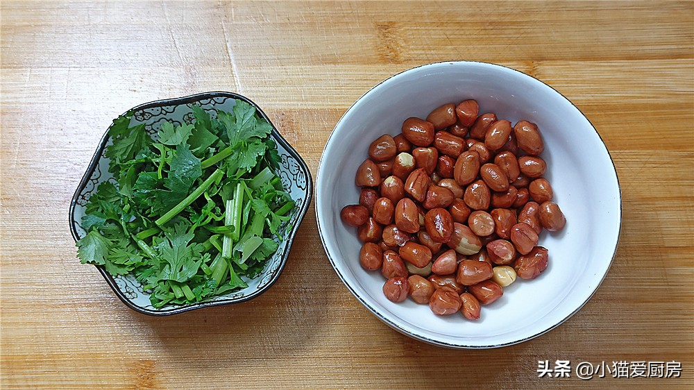 【步骤四】:锅中放入适量的油,把花生米冷油下锅,小火炒熟后捞出沥干油装盘,香菜清洗干净后切成小段备用。