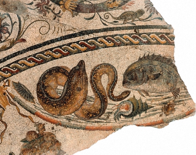 古代使用的猩红色,是从地中海东侧海岸上不同的软体动物的汁液里得来的。其中,最难得的是骨螺,也就是这幅镶嵌画里位于两条鱼中间的那种贝壳。大量的骨螺才能产生一丁点儿颜料,其高昂的价格和与权力象征的关联由此而来。这种染料的加工过程极其漫长而且相当复杂,在布料上,颜色的跨度从鲜红到深紫,其中还包含着不同的红色调和蓝色调。当然,这种红颜色并非永固不变,而是会随着时间的流逝发生转变。