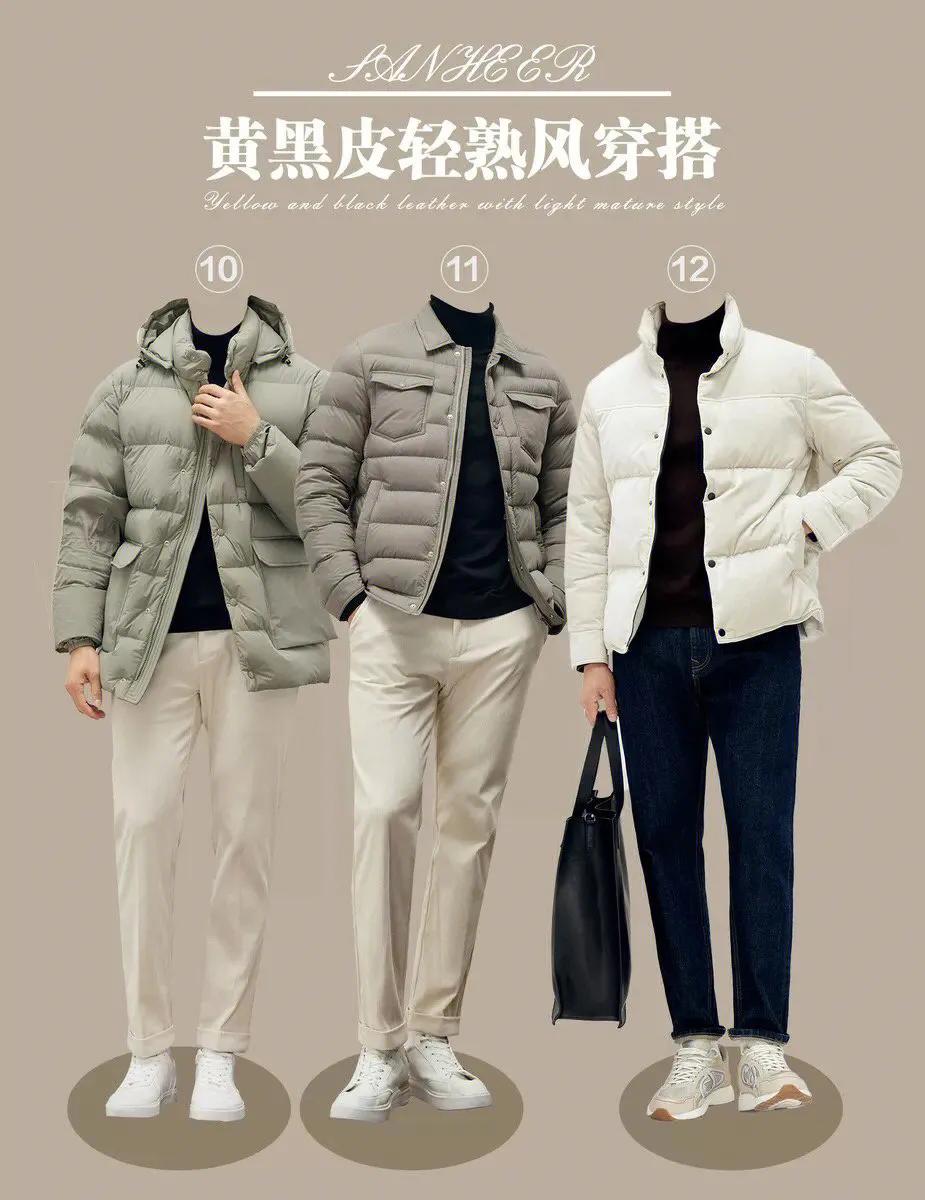 基础黑白灰配色适合黄黑皮男生,基础不容易出错。通过撞色搭配视觉会更加协调,摆脱沉闷感,而且通勤的使用率大大提高