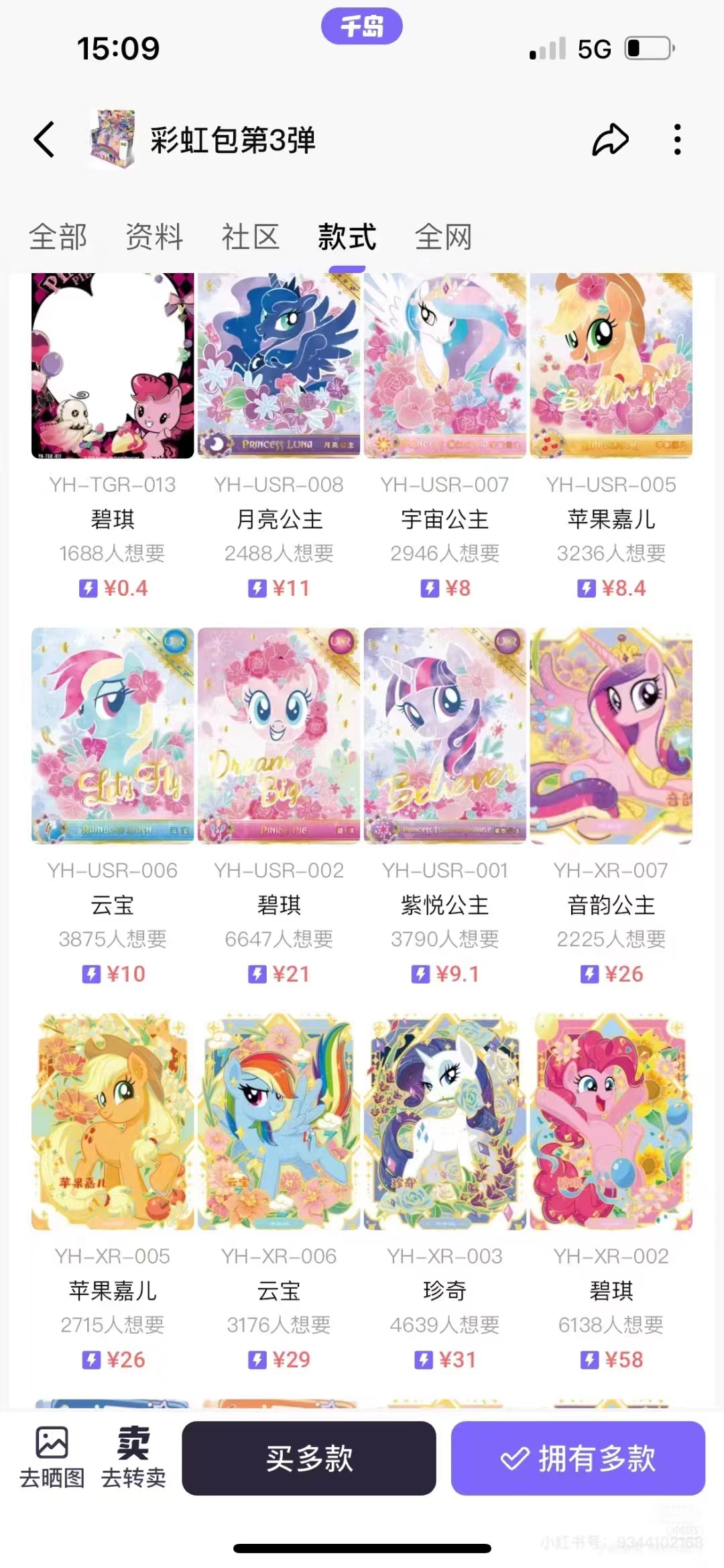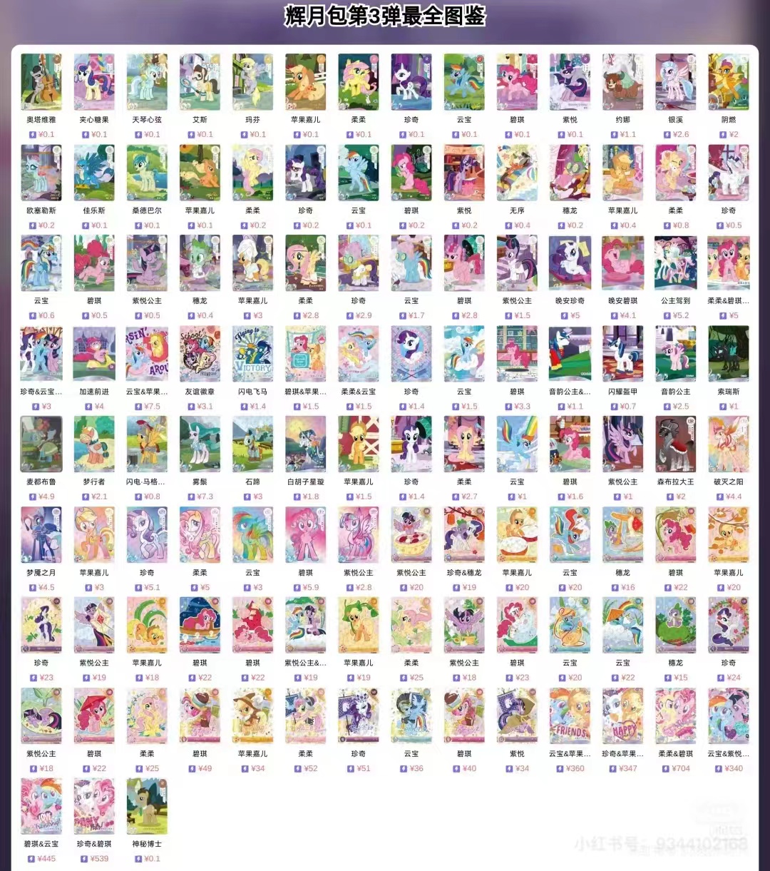上边的等级知识比较容易获得,但是笔者想获得相应卡片的价格时却发现非常难,甚至哪张卡值钱他们圈子里的人都不太清楚。比如在小马宝莉卡中,通常 “彩背” 比较稀有且价格可能相对较高,但不能绝对地说彩背就一定是最贵的。
