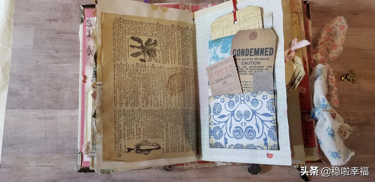 其实手账本最早是由废弃的杂志、报纸、纽扣等生活垃圾做成,所以它叫junk journal。而现在的都非常精致了,内页有各种好看的素材纸,外壳用蕾丝布料包装,加点干花干草更是锦上添花。