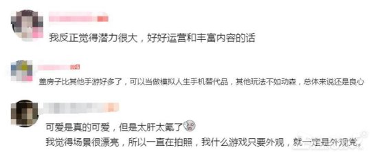 不过也有好评网友表示,好好运营和丰富内容的话潜力很大。还有网友表示,盖房子比其他手游好多了,可以当做《模拟人生》的替代品,其他玩法不如《动森》,总体来说还是良心。还有网友表示,可爱是真的可爱,场景很漂亮,一直在拍照,但是太肝太氪了。