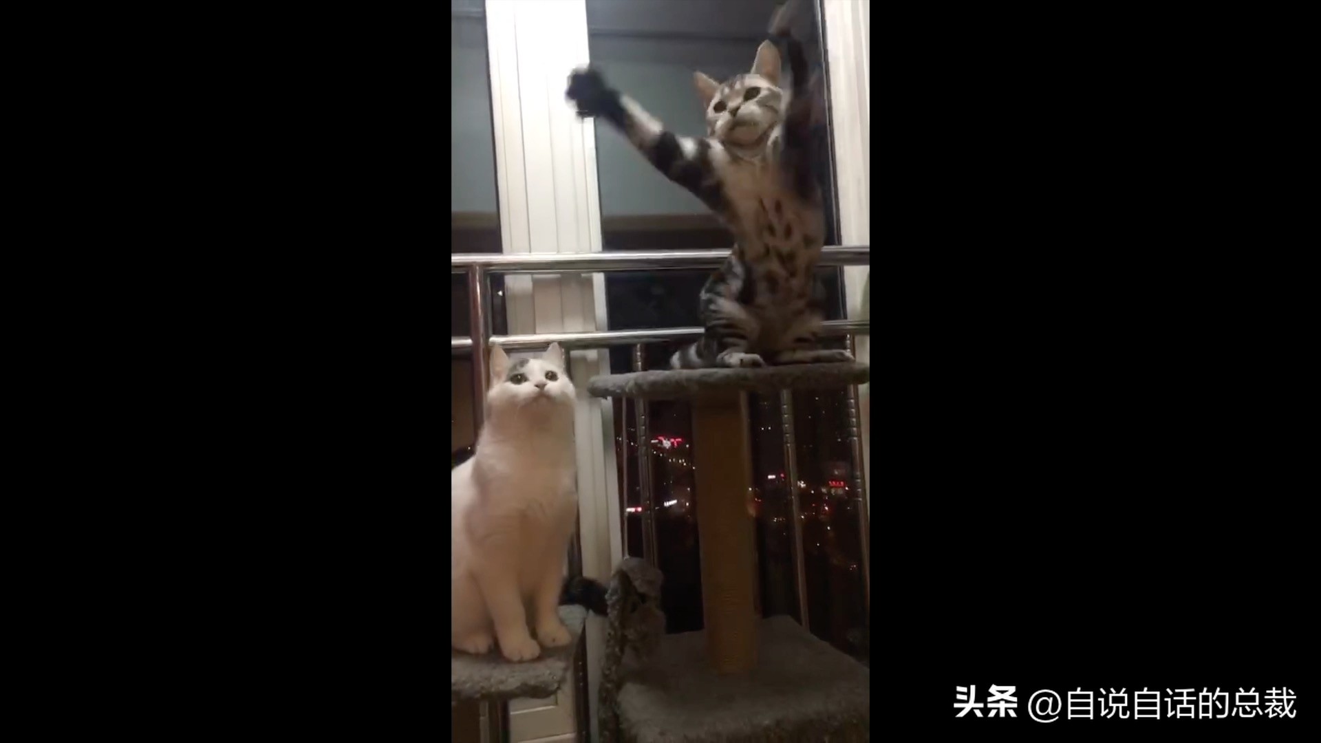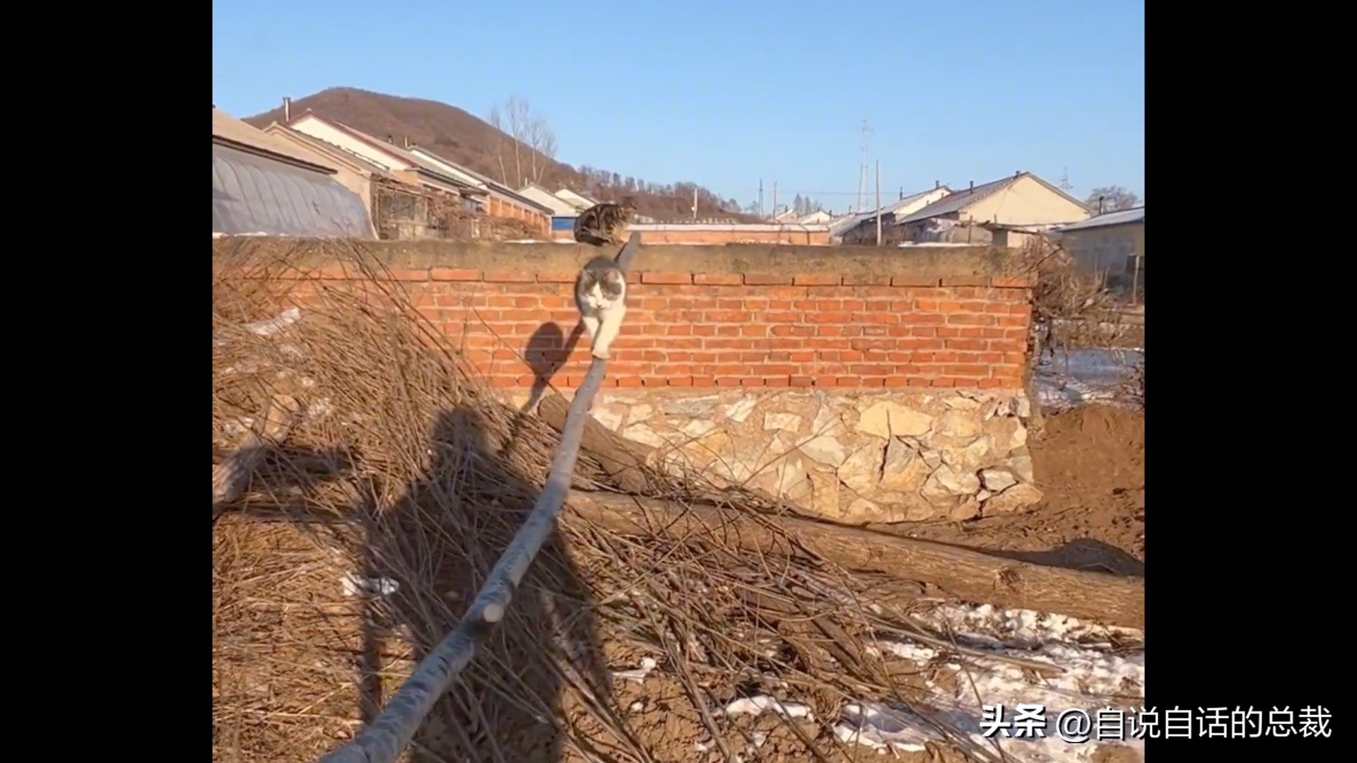 在这段影片中我们可以看到,左边那只小猫在即将掉落高墙的瞬间,一个鹞子翻身就从另一个角度稳住了身形,动作干净利落,透着一股潇洒劲儿,妥妥的平衡大师本师。