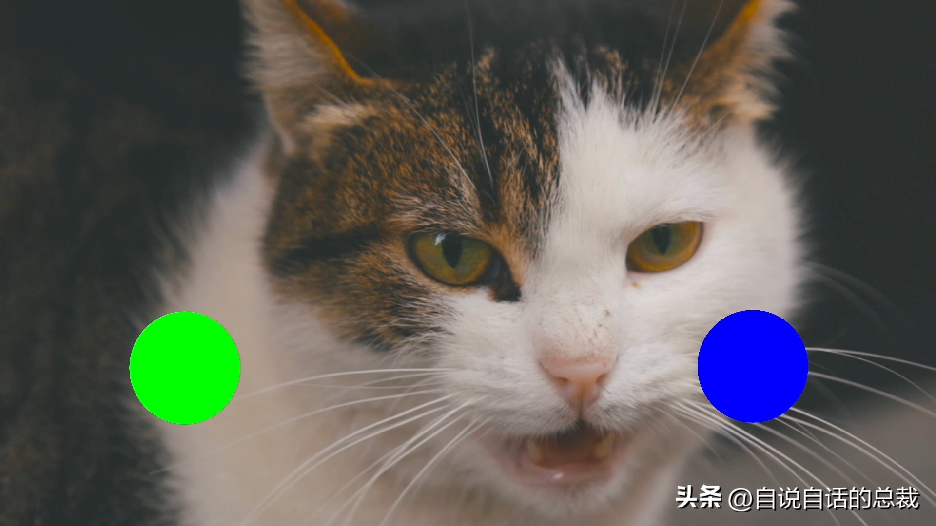 接下来是我们的猫咪,但非常不幸,它只能看到绿色和蓝色,视野里总是一片灰突突的,它对颜色认知,大约只相当于人类的百分之一。