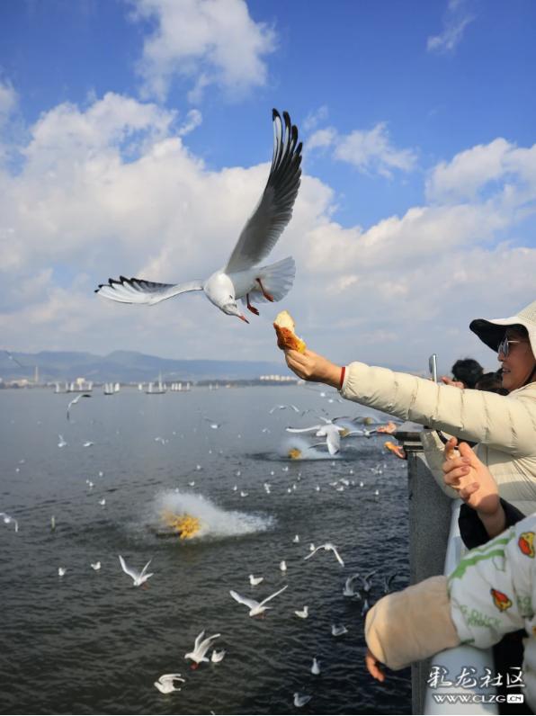 我们5元购买了一袋鸥粮,站在滇池大坝临海围栏边上,用单手高举“鸥粮”,不一会儿海鸥就成群结队的过来抢食物吃了。这时候,迎着海鸥飞行的方向,举起相机就可以很好地抓拍到海鸥的精美瞬间。滇池的海鸥亲和力很强,它会偶尔站在手掌之上,独自慢悠悠地享用美食。如果再不被惊扰的情况下,海鸥会把手中的鸥粮全部吃完才展翅飞走。人与动物和谐相处,春城处处可观鸥,滇池大坝这里独好。