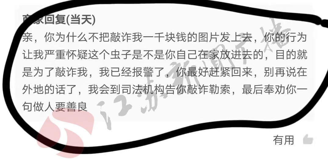 镇江一女子外卖咬断半条虫子吞下后呕吐不止 索赔千元遭商家报警敲诈