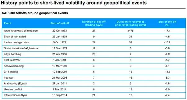 长期趋势表明,战争引发的大幅抛售通常都是短暂的,尽管冲突或战争预期最初可能产生负面影响,股市会经历一定的动荡和调整,但不断升级的地缘政治不确定性并未导致市场持续或长期下行。