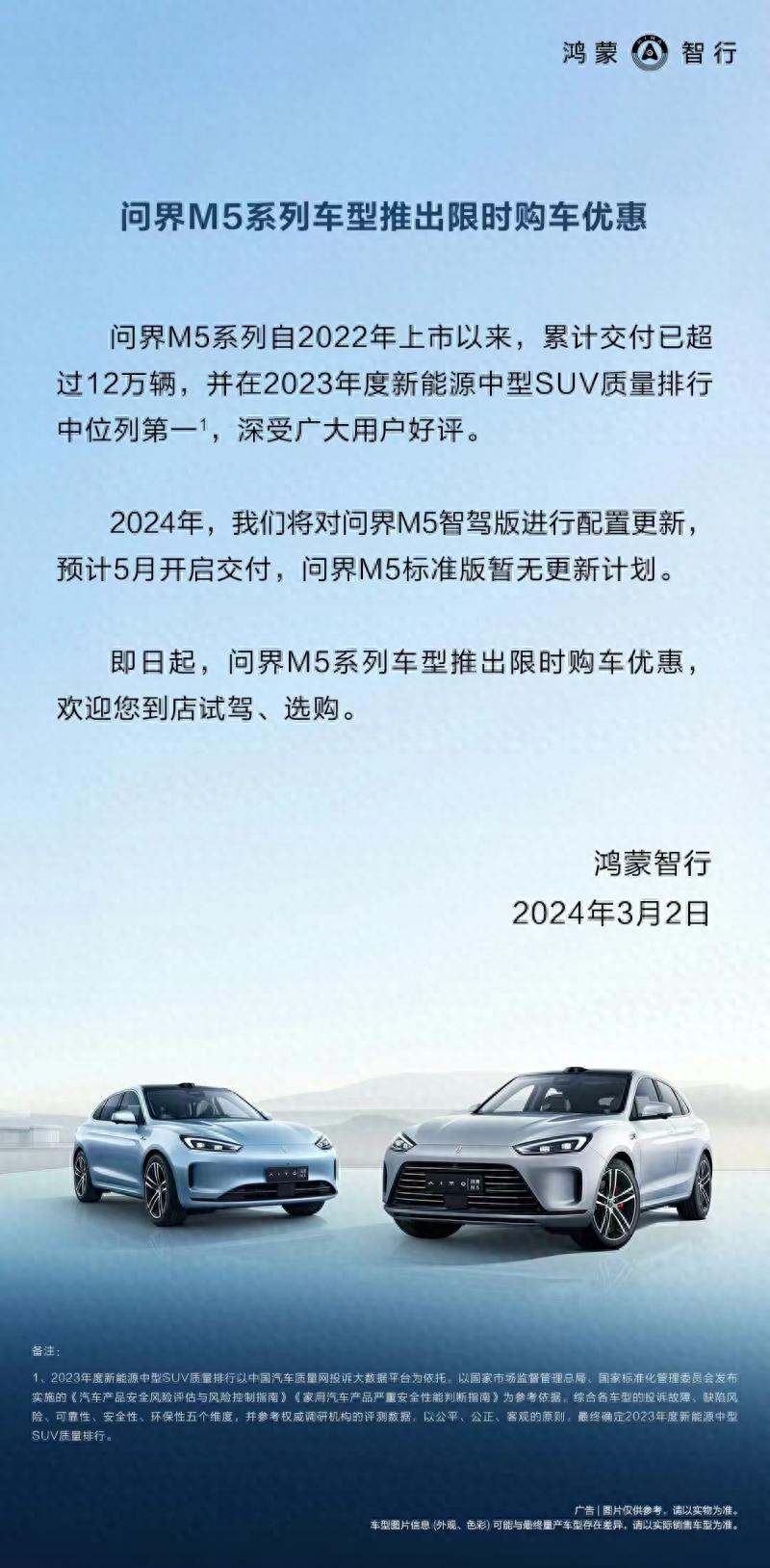 2024年3月2日,根据AITO汽车/鸿蒙智行等多个官方微博的消息显示,AITO旗下问界M5智驾版车型即将迎来全新版本,另外,目前现款问界M5已开启限时购车优惠。