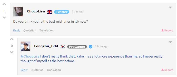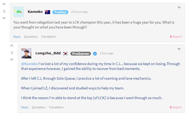 Bdd:当我在CJ时,我失去了很多自信,因为我们一直在输……不过通过那段经历,我学到了如何从低谷中恢复。离开CJ后,通过大量单排,我练习了游走和对线能力。当我加入龙珠后,我不停学习如何能够帮到我的队伍。我认为,我之所以能够获得LCK冠军,是因为我经历了这么多的事情。