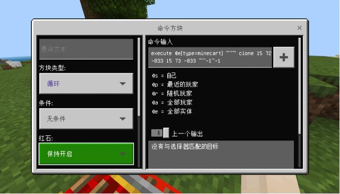 放置一个在地上打开并输入testfor @e[type=item,name="生鸡肉"],方块类型选择循环,条件设置成无条件,红石选择保持开启,这条指令的意思是检测周围是否有掉落的鸡肉,有则输出红石信号