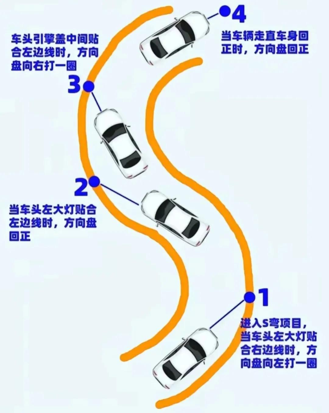 不限时,完成正或反S曲线其中一种,基本原则是"见线压线,无线不动″,身体坐正,抬头看到前方曲线。