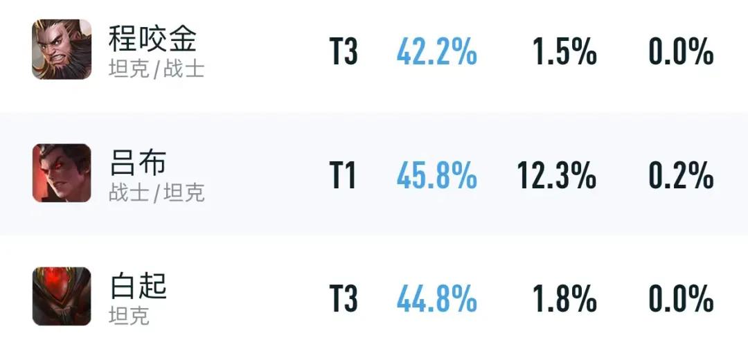 坦边就更不用说了,几乎全员都是胜率垫底,就连吕布这位边路“质检员”,出场率都从21%降低至12.3%,胜率更是仅有45.8%,已经成为最大的“版本陷阱”了。