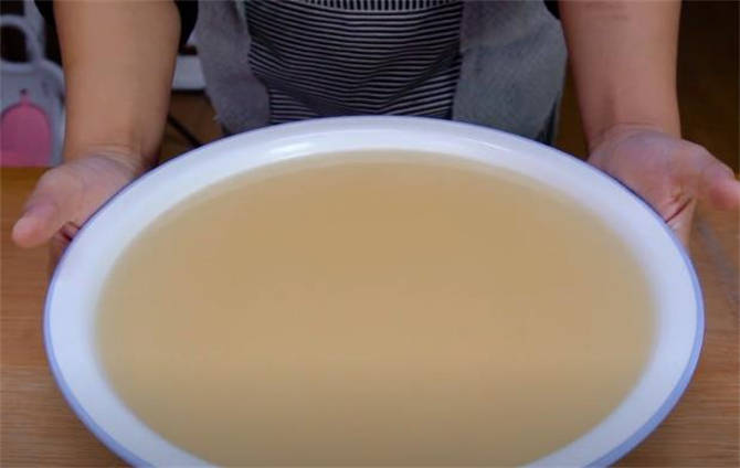 6.这个面粉水我沉淀了一个晚上,其实四个小时就行了,它上面是一层黄色的水,咱们把它倒掉。