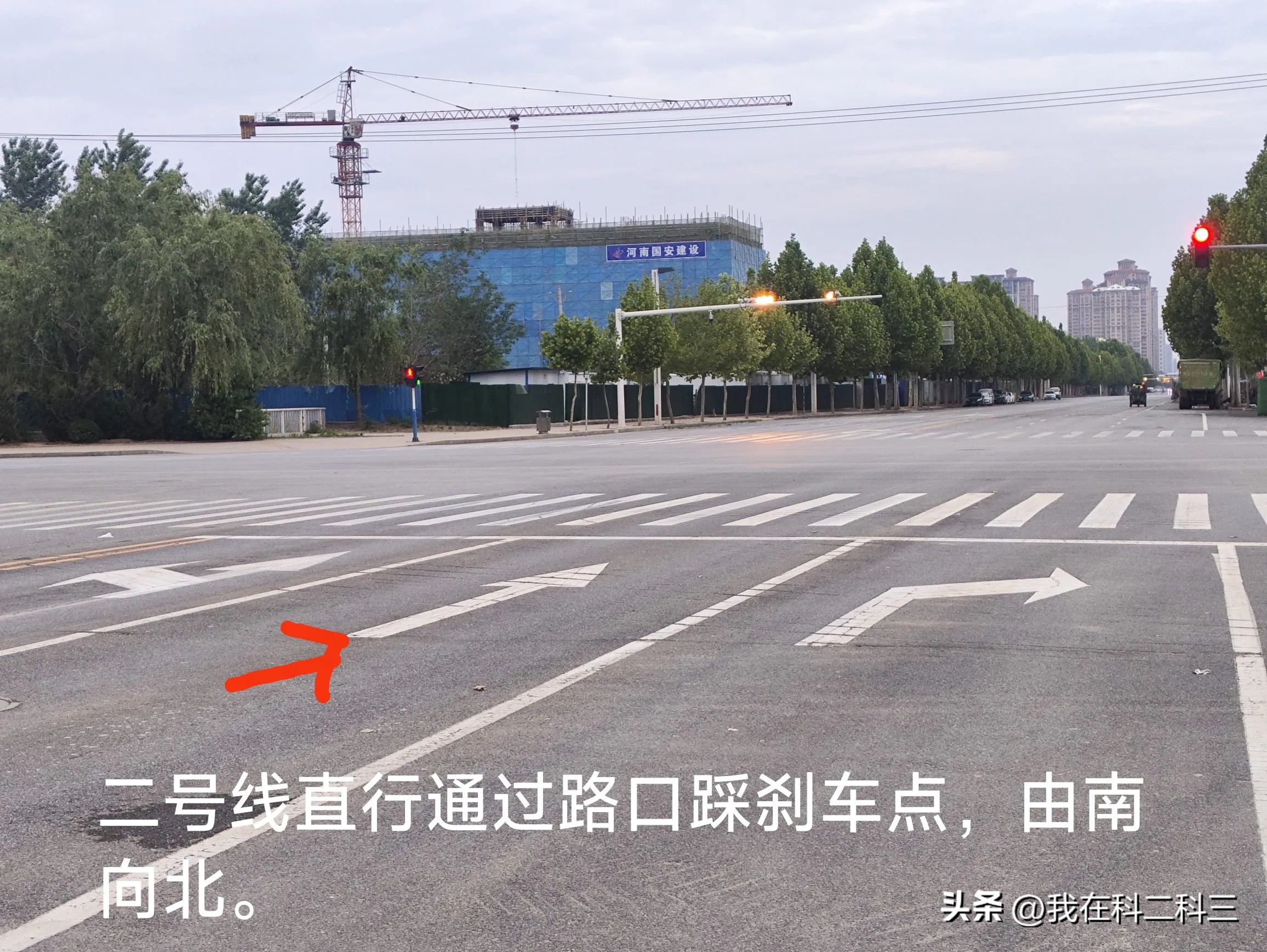 路口直行:听到路口直行通过路口指令后,注意观察前方红绿灯,左右观察路口路况,绿灯保持25-30车速,待车头盖住剪头尾部踩刹车通过。如遇红灯,踩离合,轻踩刹车拖之直行剪头尾部停车。停车就踩刹车了,绿灯可以直接起步通过路口。如果停在了第二或三辆车,到刹车点上一定要踩一脚刹车。路口直行不能超过30,否则直接挂。