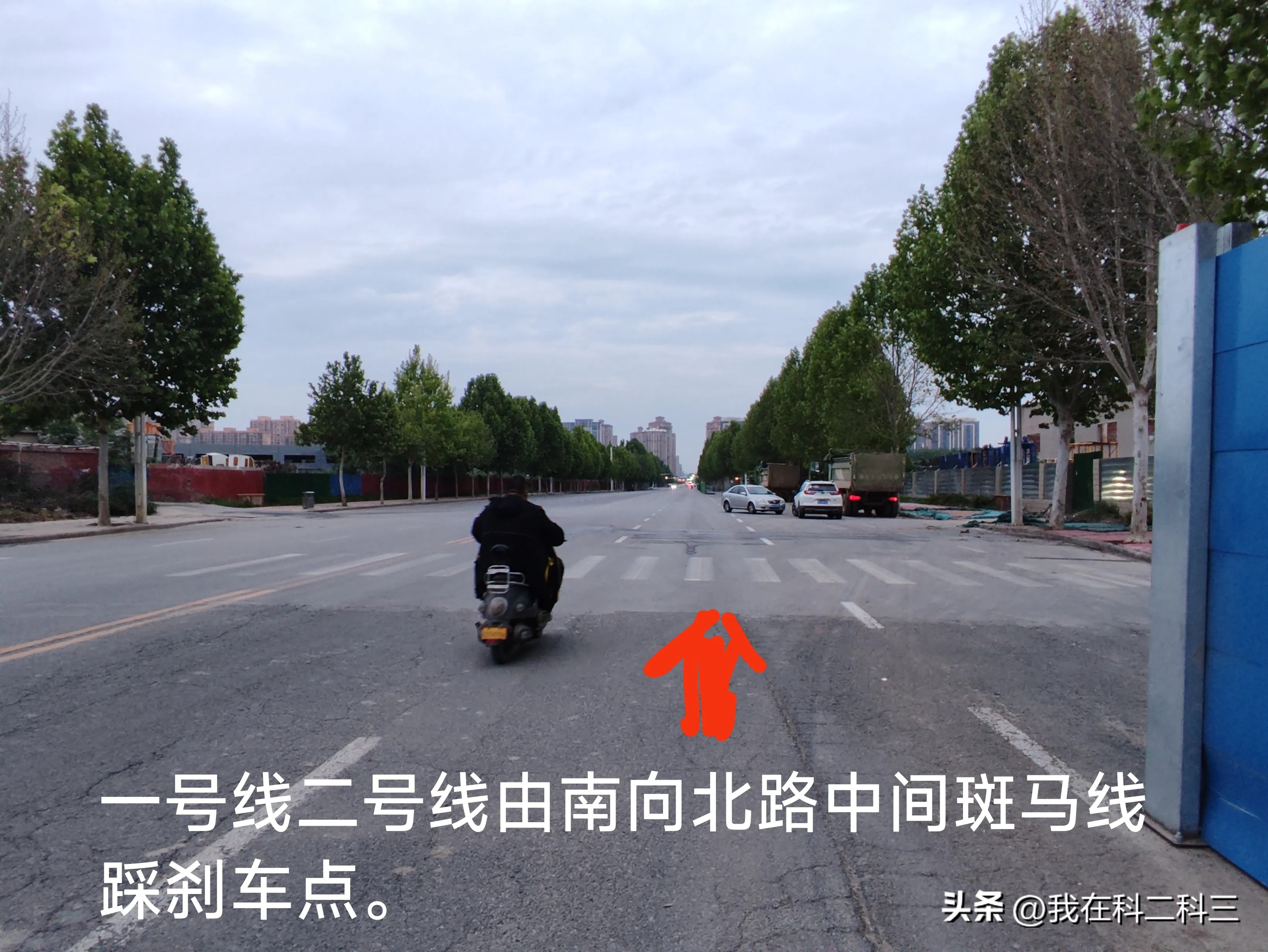 路中间斑马线:车辆保持25-30行驶,车头离斑马线5-6米踩刹车。