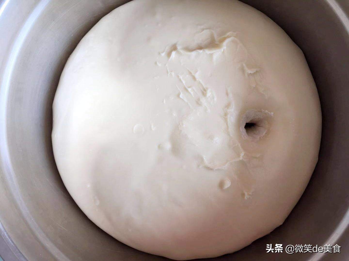 5,面团发酵至2倍大,用手指粘干面粉在面团上戳一个洞,洞口微微回缩即可进行下一步的操作,如上图所示。