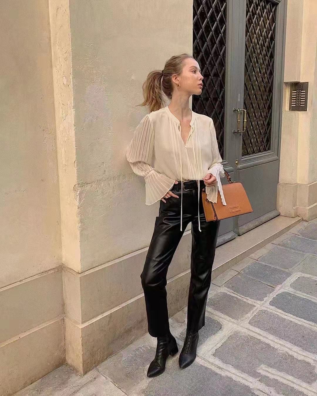 它并不像牛仔面料一样,可以设计成休闲喇叭风或者嘻哈破洞风,所以这款单品带有局限性,对身材的挑剔性比较高,因此很多女性也不愿意轻易尝试。如果能驾驭的好皮裤,可以挑选一件浪漫的飘带衬衫与之结合,格调相当高雅贵气。