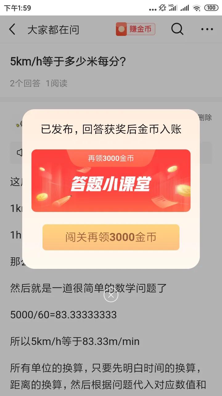 2.接着,你就可以选择一些你擅长的领域进行回答,我找了一道很简单的单位换算问题,问题是5千米每小时等于多少米每分钟。这个题是很简单的一道物理题,写了108个字就解答完成,其实这个题字数都用不了这么多,那么你需要满足100字,你就可以把你运用到的知识点进行分析解释一下,最后做个总结就很轻松100字啦。