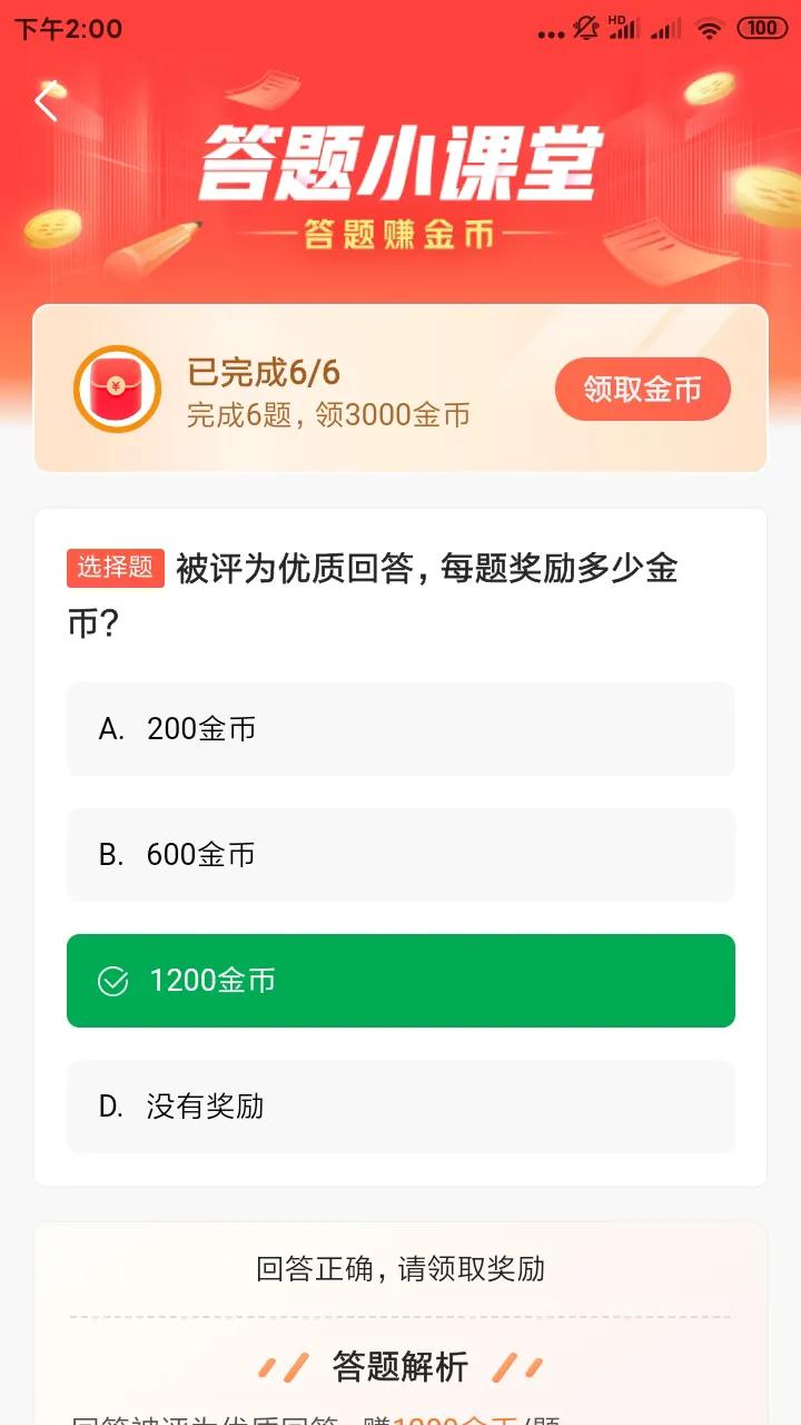 3.你回答一道问题,会有个弹窗,闯关再领3000金币,它里面是6道关于答题小知识的问题,只要你刚才认真看了规则就可以很轻松答对,其中有个题是判断是否属于优质回答,一定要看看回答是不是题里面问到的,切记不可粗心大意。
