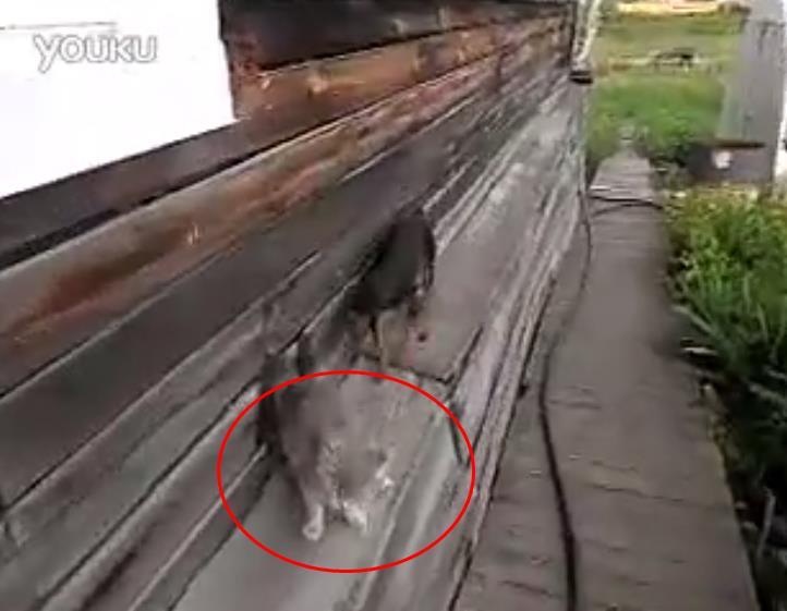 有些猫咪不喜欢接触外面的世界,但有部份则是相当喜欢在户外游逛;这只灰猫就是属于后者,当主人派狗狗去叫它回家吃饭时,贪玩的灰猫跳上又细又窄的屋檐。
