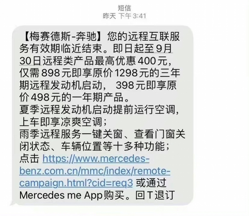 据该博主表述,他在奔驰车辆远程互联服务有效期即将结束时,收到一条来自奔驰方面的发来的“关怀”短信。短信内容称,如需继续使用远程互联服务则要续费,一年服务费398元,三年服务费则为898元。据了解,该服务包含夏季远程启动发动机,提前运行空调、雨季远程一键关窗、查看门窗关闭状态,车辆位置等十多种功能。续费短信曝光后,奔驰的付费OTA举动引发争议。部分网友认为,远程互联服务包含在车辆落地整体费用中,奔驰方不应再收费。