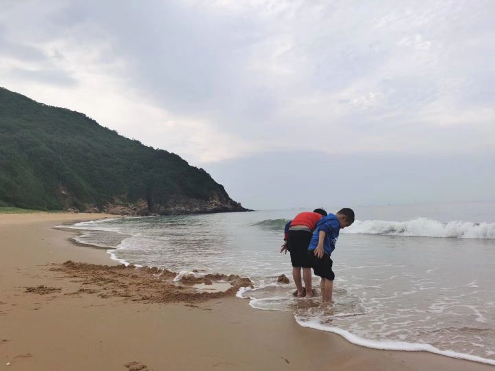 下了山坡,还要翻过一大片嶙峋的石头才能去到沙滩,沙滩除了漂浮过来的东西没有游客带来的垃圾,长长的弯月型的沙滩上我们没有其他人,安静得只有海浪的声音。放无人机上去,看见海滩很多离岸流,所以并不适合游泳,玩玩沙子堆沙堡钓沙钻也是很好的。