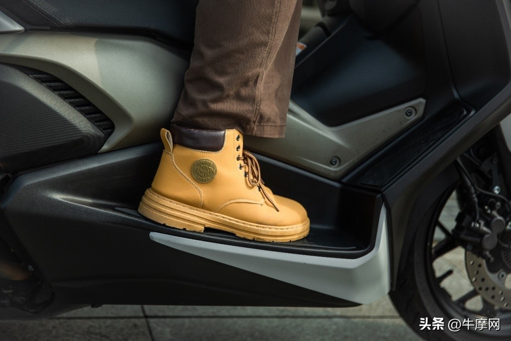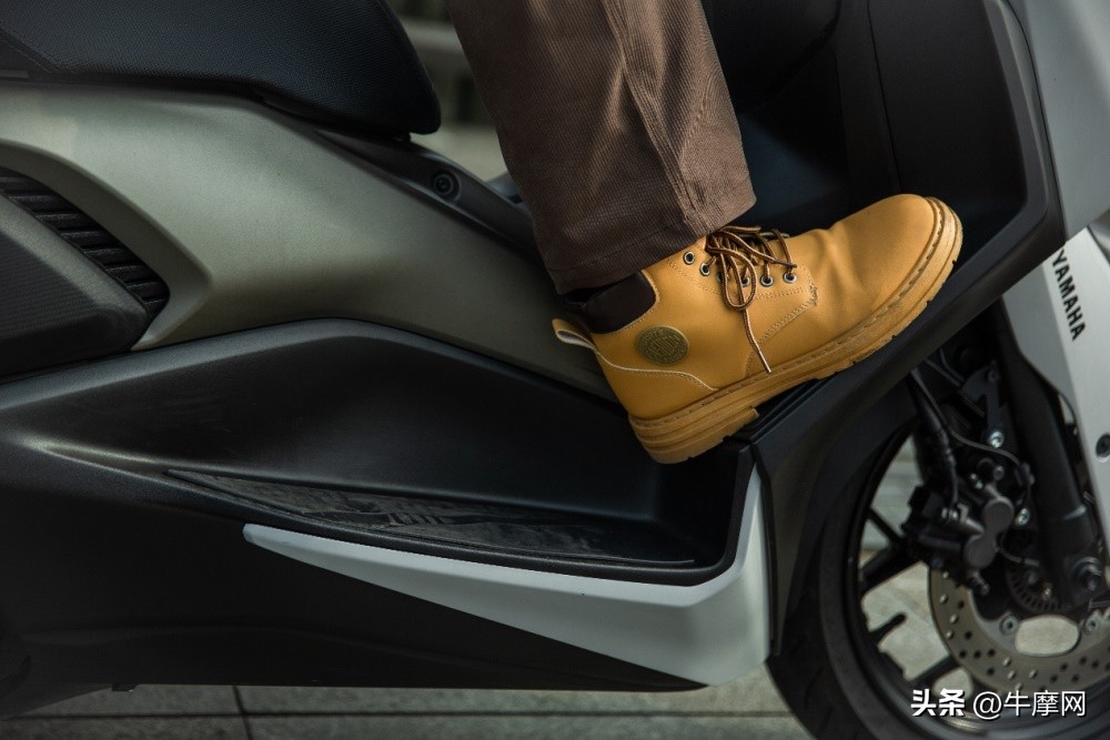 XMAX还是一贯的龙骨踏板,两侧用的一整块磨砂漆面的装饰盖板,TECH版本则是钢琴漆面饰板,并非市场上常见的纯塑料表面。脚步活动空间还算充足,斜踏板略短,和平面踏板做了分层处理,虽然丰富了细节,但是踩斜踏时脚后跟没有支点。