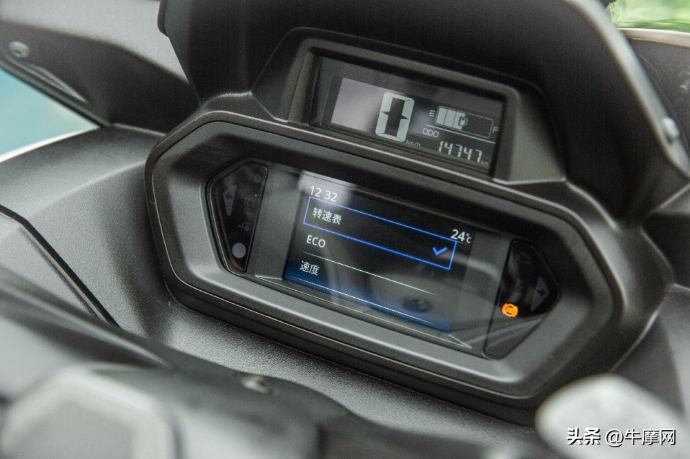 XMAX在仪表方面采用了上下分屏,上方3.2英寸的LCD仪表只显示时速、油量、里程信息,常规照明环境下清晰可见。下方是4.3英寸TFT液晶,主界面可以切换显示油耗、转速、速度,小编个人意见是日常选用转速界面最好,速度信息和上方仪表重复,而油耗界面略微有延迟,希望未来雅马哈可以改进。