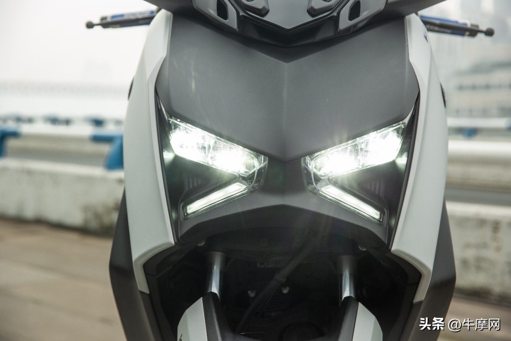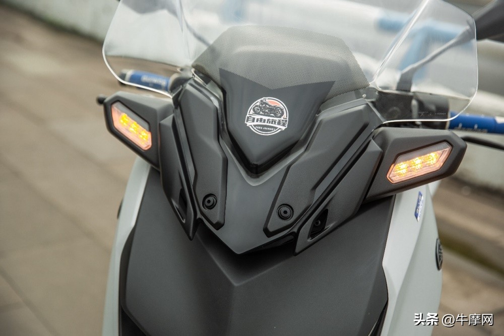 前脸简化了细节,线条非常的硬朗锐利。粗看前脸的线条像字母X,相较老款更加干练,装配工艺在目前市场踏板车里也算上乘,接缝非常紧密有序。老款分布在前脸两侧的转向灯变换到了风挡两侧,也升级为了LED光源,道路上识别性更高,提高了安全性。