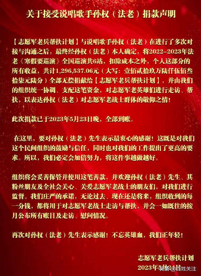 5月24日,“志愿军老兵帮扶计划”官方微博发布声明:收到说唱歌手法老129万元捐款,这些款项均为其个人巡演收益。随后法老发博表示,“感谢粉丝的赞助,我只是传递者。” “从今往后所有个人巡演的我的部分演出收益,都会捐助给有需要的组织或个人,欢迎大家持续监督。