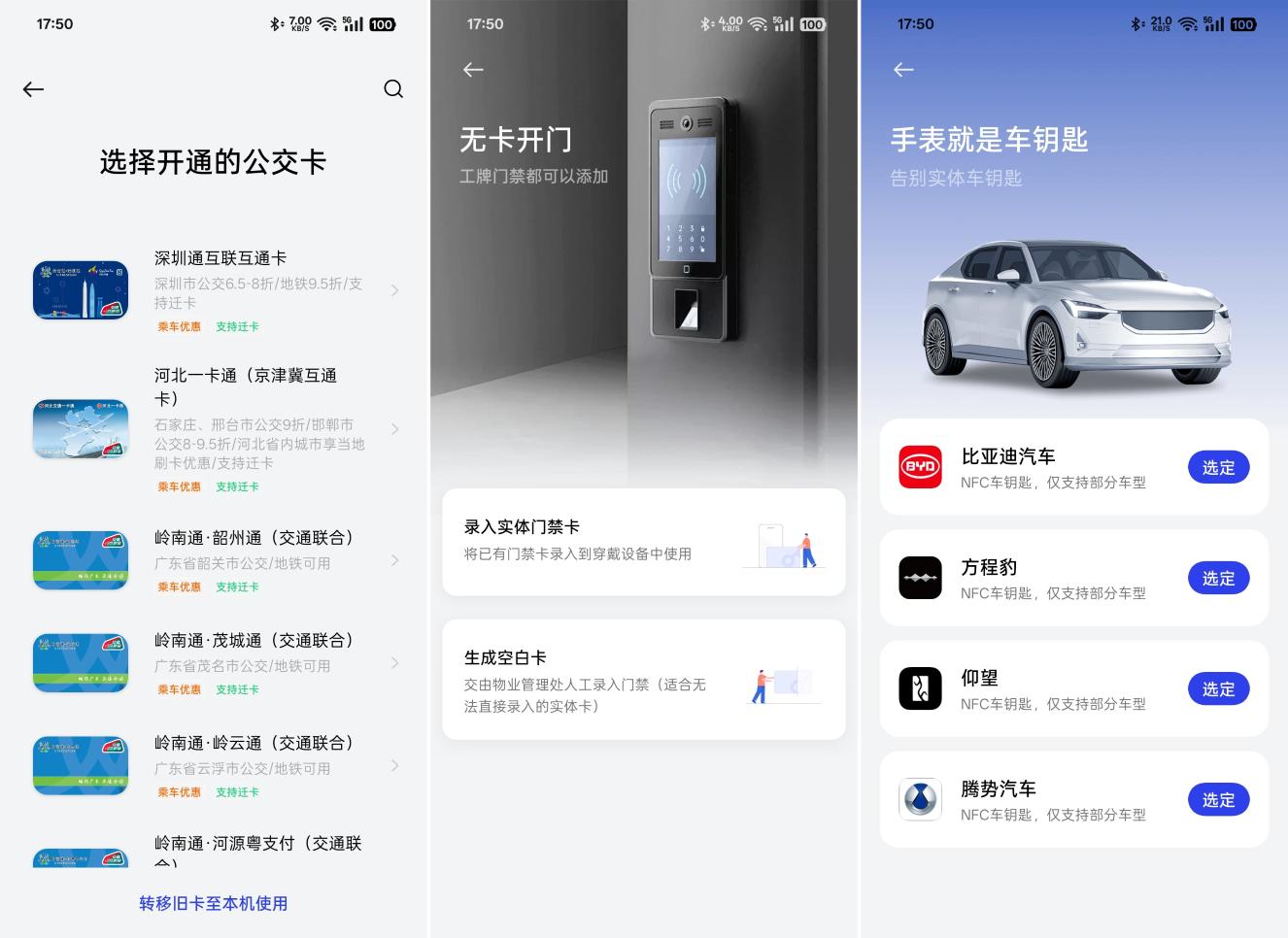 基于OPPO Watch X2自带的NFC线圈,手表的钱包功能提供全国超300座城市的交通卡开通,并支持用户录入门禁卡。