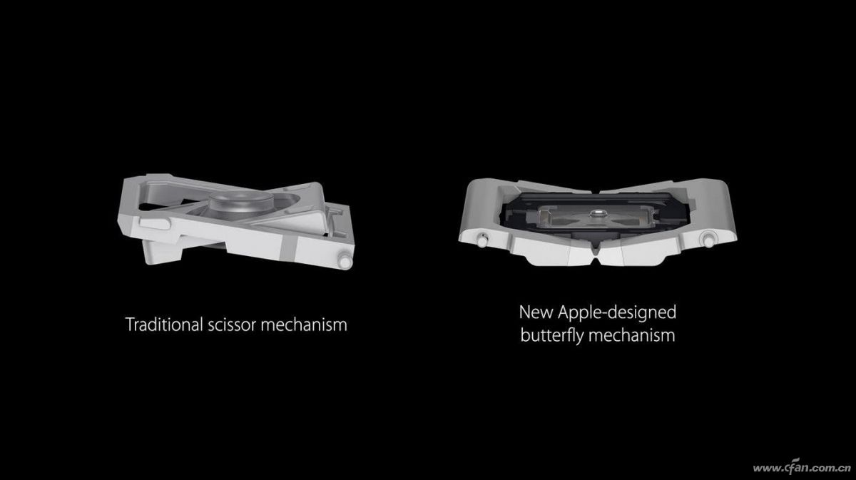2015年~2019年上市的MacBook系列引入了“蝶式键盘”的概念,相比之前的X结构减小了40%,可以大幅减小键盘模组的厚度,但其键程也下降到了1mm左右,导致敲击手感变弱,还存在较高的故障率,因此苹果从2020年开始逐渐将笔记本的键盘从蝶式换回了剪刀式。