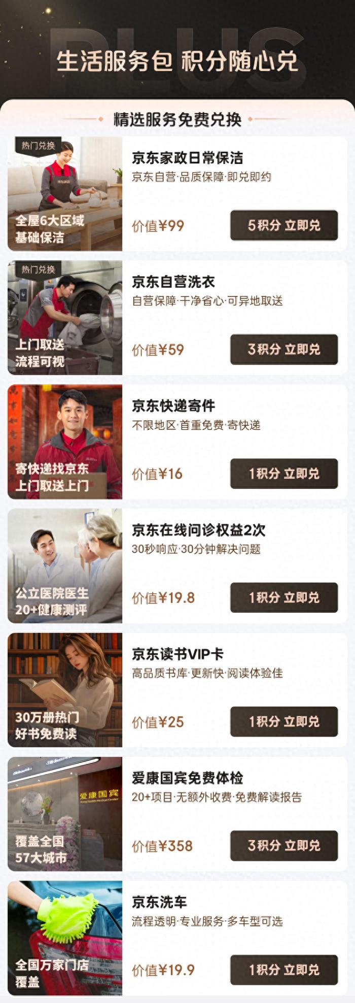 新年伊始,京东PLUS会员权益全面升级。首先,京东PLUS会员整合原有的多项生活服务权益,全新推出“生活服务包”,京东PLUS新会员开年卡即可获得12积分,按需免费兑换“生活服务包”里的相关权益,包含家政保洁、洗衣洗鞋、标准洗车、免费寄快递、免费问诊、读书VIP月卡、免费体检7大特权。比如,京东PLUS会员用3积分可以免费兑换一次价值358元的体检服务,5积分可以免费兑换一次价值99元的家政保洁服务。京东PLUS老会员则可按照会员剩余天数获得相应比例的积分,随心兑换相关权益。