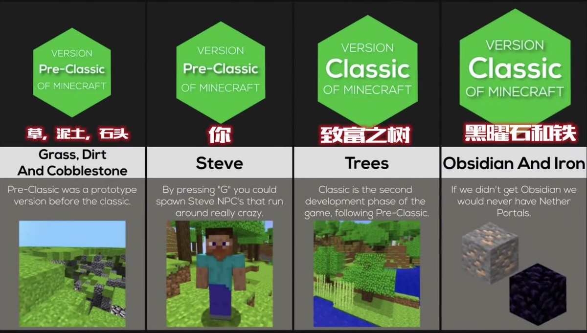 在最早的Pre-Classic版本中,最具代表性的更新,当然是加入了草,泥土,石头以及各位冒险家们在游戏中操作的角色,史蒂夫啦!而在后续的Classic版本中,则是加入了每位玩家都会撸的树,以及黑曜石和铁这两种基础石头方块。