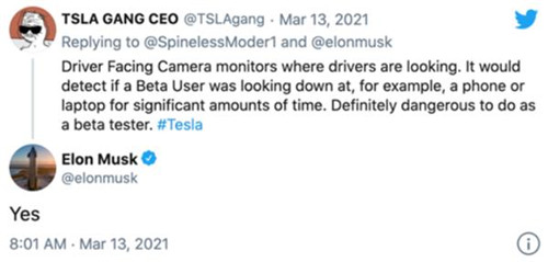 此前,外媒曾报道马斯克宣布将关闭一些用户的FSD Beta的权限,因为这些用户在使用该功能时,未能将注意力完全放在路况上。这条取消权限的新闻,引发网友“特斯拉为何能知道车主行为,是因为摄像头正对司机吗?”的猜测。对此,马斯克直接回答“Yes”。自此,网络上掀起数轮关于“特斯拉车内摄像头在监测车主”的相关讨论。