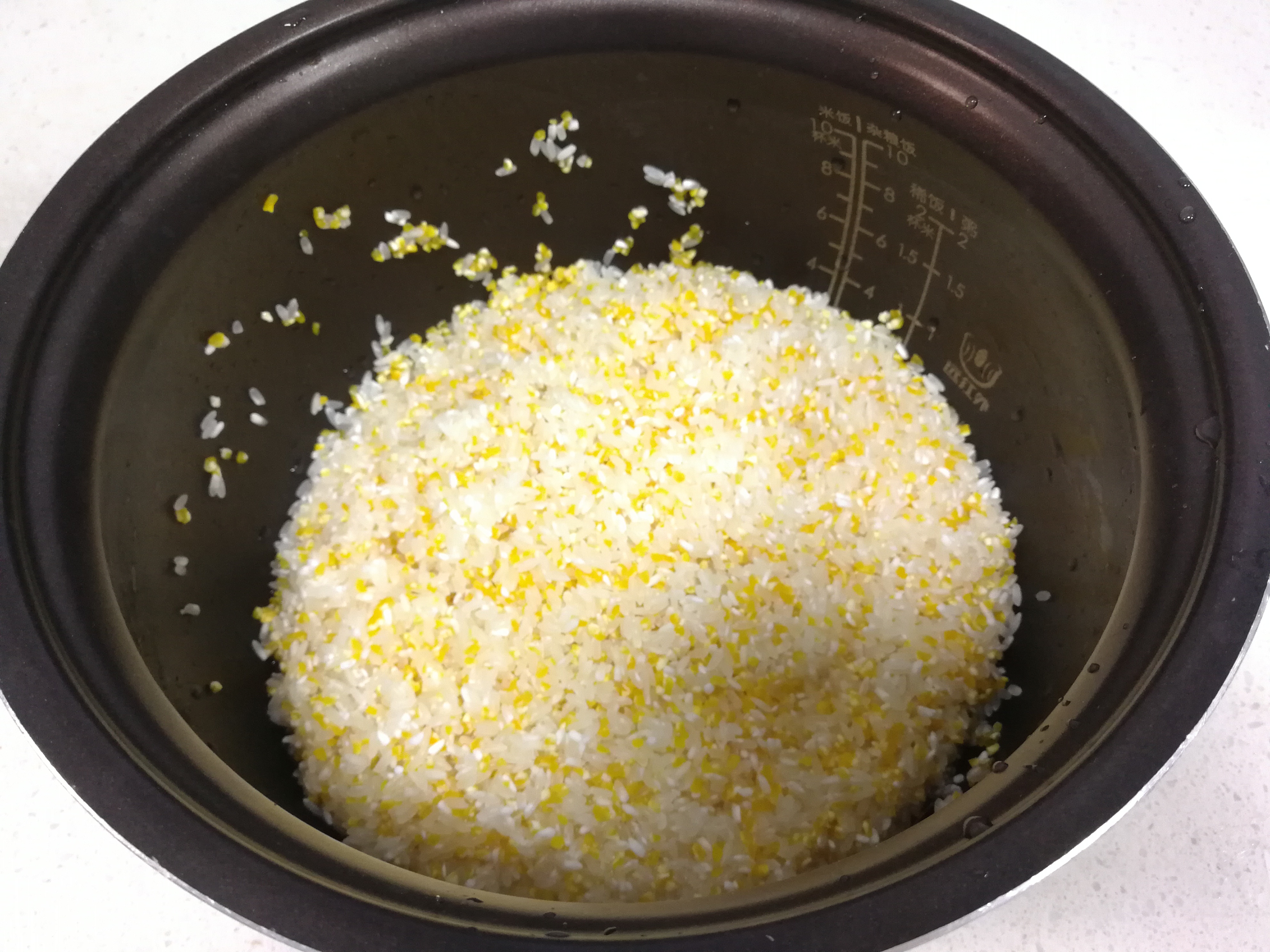 3、把大米、玉米碴子倒入电压力锅内胆,淘洗干净沥干水。