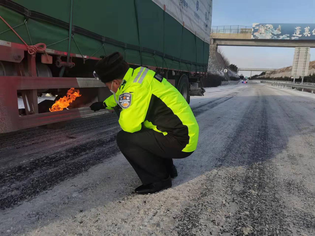 民警迅速在车辆后方摆放了三角警示标志,并做好防护措施,设置好警戒区,随即上前查看情况。经询问得知,该车行驶至此处时,车辆突然发现故障,司机正对车辆进行检查,正准备拨打110报警求助。民警了解情况后,与司机共同检查车辆状况,10分钟后车辆简单维修后重新发动,民警又在车辆轮胎下撒沙助力货车慢慢启动驶离高速。