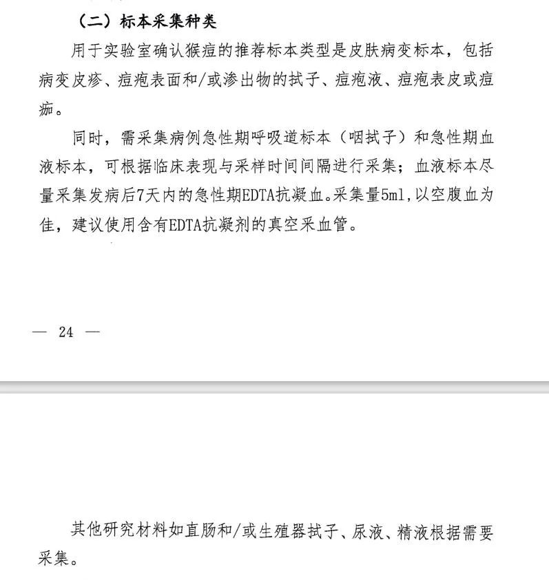一听到核酸检测,那些已经被捅到嗓子长茧的人就吓坏了,难道还得咽拭子吗?目前还不好确定,但关于检测标本的类型,在上述文件:《猴痘防控技术指南(2022年版)》的附件3中已有明确:用于实验室确认猴痘的推荐标本类型是皮肤病变标本,包括病变皮疹、痘疱表面和/或渗出物的拭子、痘疱液、痘疱表皮或痘痂,其他类型的标本更多的是留待研究使用。