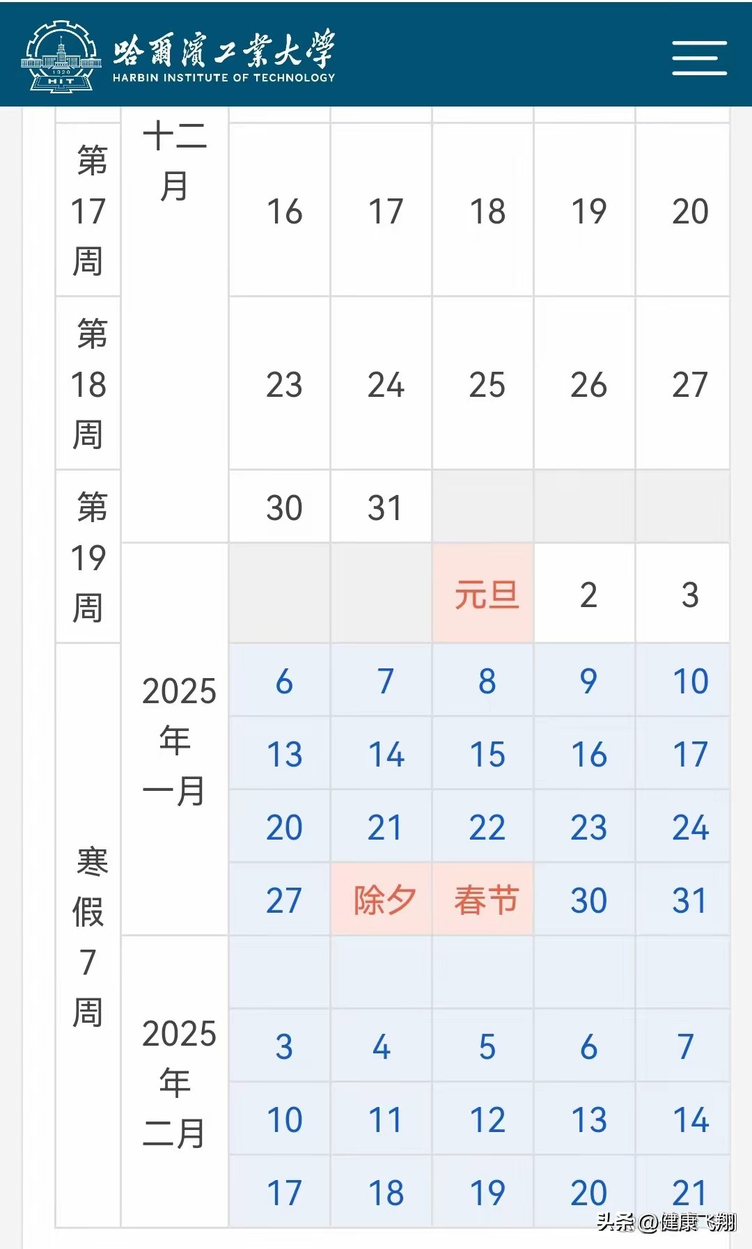 可以看到,哈工大元旦之后就将放寒假,是三十九所985高校之中放假最早的一所,如果期末考试结束早的同学,元旦也许就可以和寒假接上了。