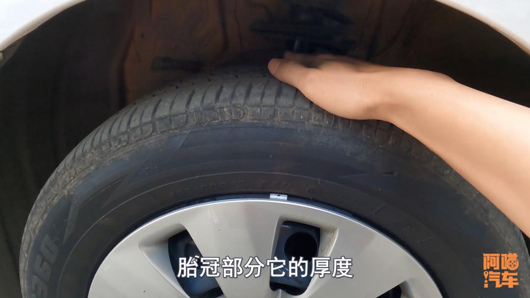 轮胎上正面部分称之为胎冠,它的厚度能有十几个毫米,这是最厚的。胎壁是轮胎最薄弱的一个部分,尤其是外侧的,也是最容易发生刮蹭的,胎壁只有胎冠一半的厚度,也就只有5个毫米左右,所以这个地方一旦刮了两个毫米,肯定会担心它顶不住,尤其天气这么热,一上高速轮胎胎压又大,它会不会直接从这个口炸开。