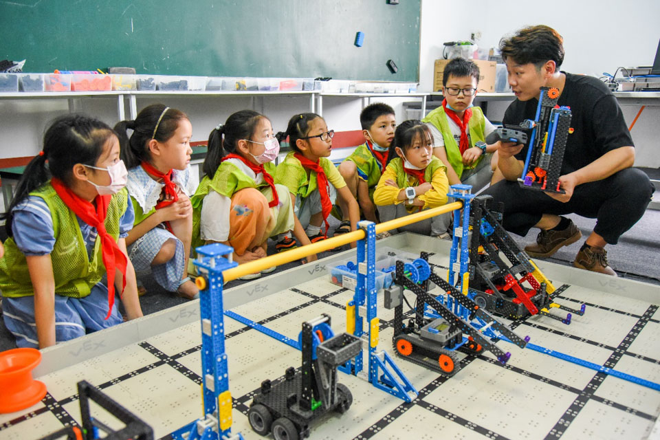 2021年7月5日,武汉市汉阳区一青少年空间,志愿者在托管室给小朋友上创意编程课。 (视觉中国//图)
