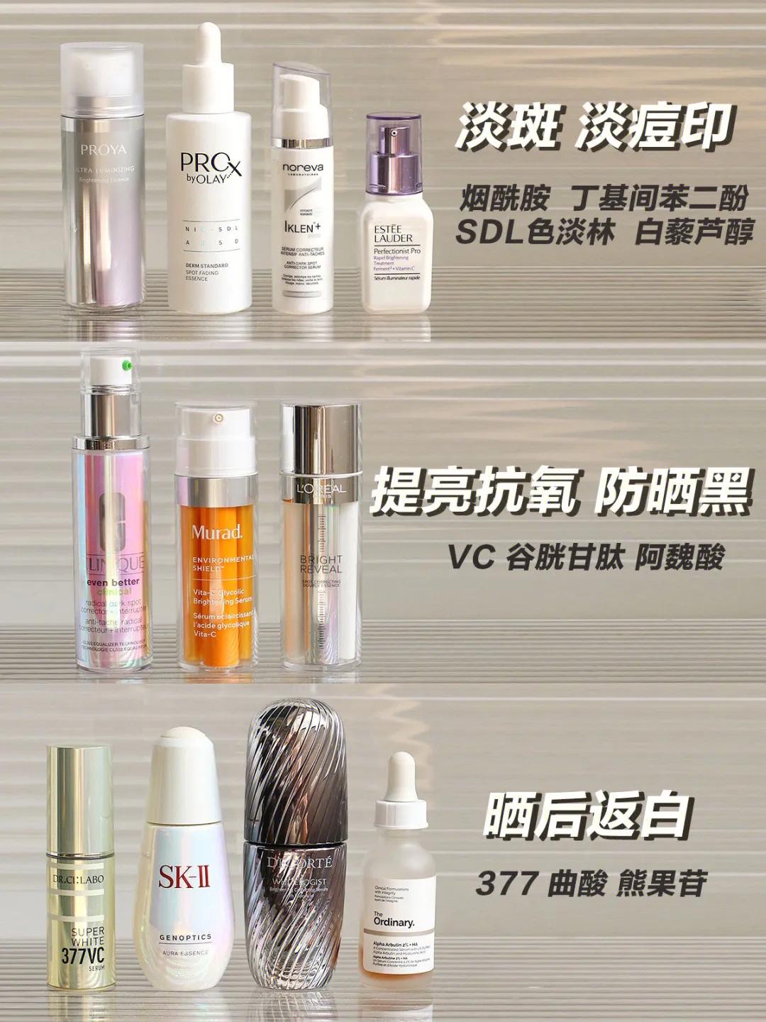 在做好了防晒之后,我们再来考虑美白产品的加持,美白产品是否有效,是否是短暂的障眼法都取决于成分,要认准有效的美白成分和浓度。