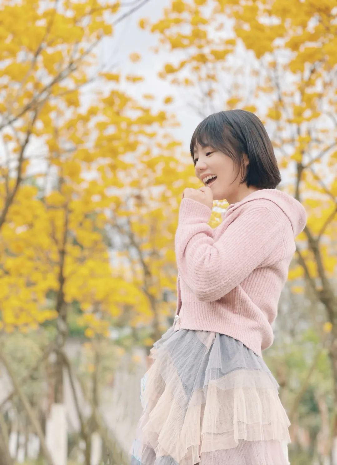 比如赏花季节,看花的地方人都很多,为了拍到一个相对干净的背景,我们就需要往边上走一走,看一看,找个人相对少一点的,长焦,低机位,缩小取景范围,人像模式拍摄。下面两图樱花和黄花风铃木,都是选择靠近路边的树,虽然不如林子中间的花茂密,但胜在人少,可以获得干净的背景。