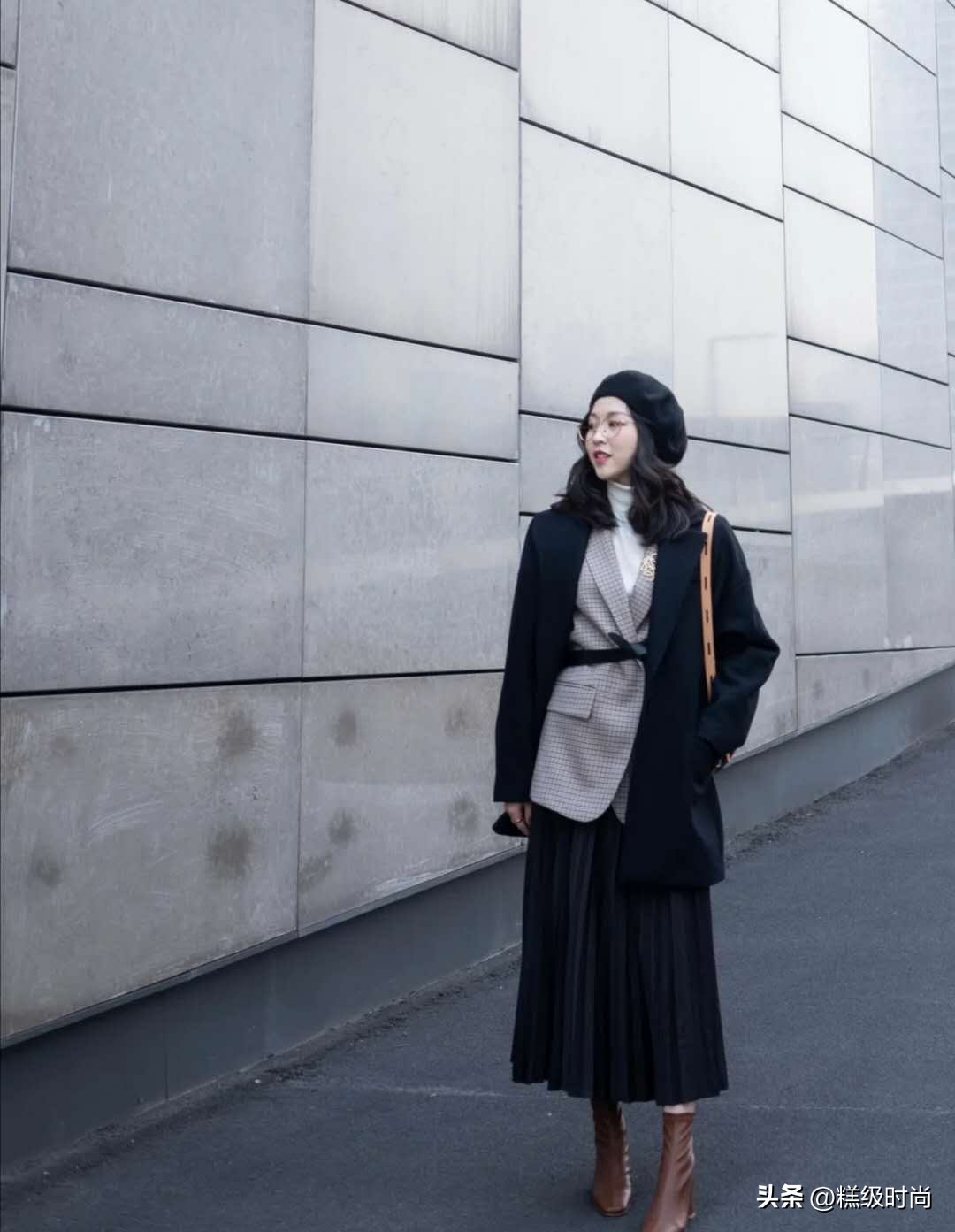 短款外套配搭高腰裤或高腰裙,能有效拉长下半身线条,特别是选择裤装时,搭配一双同色系的高跟鞋,可以无缝连接,进一步增强腿部延伸感,显高效果显著。
