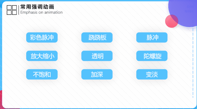 强调动画使用最多的是:彩色脉冲、放大/缩小、陀螺旋、跷跷板等